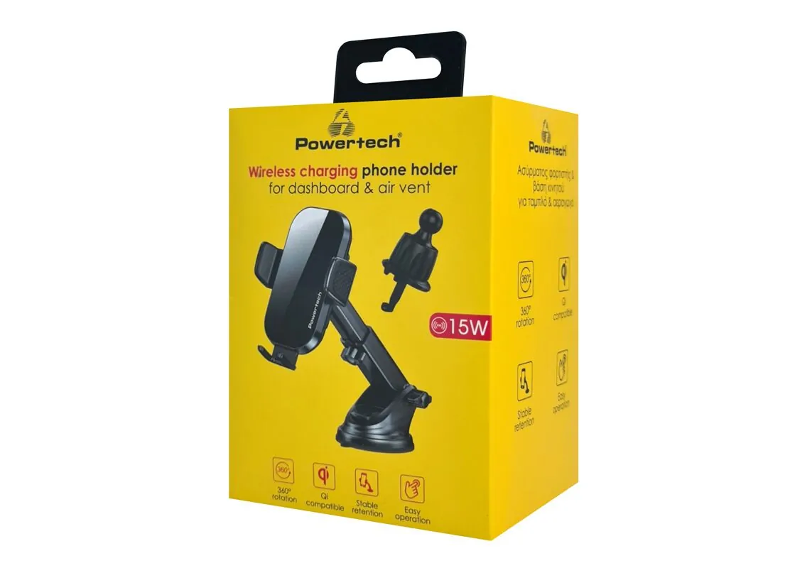 POWERTECH ασύρματος φορτιστής & βάση αυτοκινήτου PT-1271, 15W, μαύρος