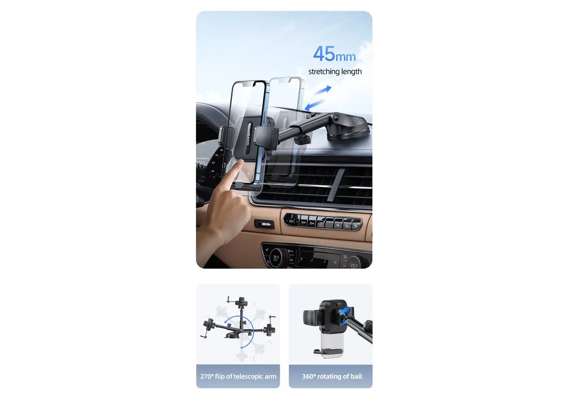 Διαθέτει τηλεσκοπικό βραχίονα και στερεώνεται εύκολα με ισχυρή βεντούζα σε οποιαδήποτε επίπεδη επιφάνεια του αυτοκινήτου.