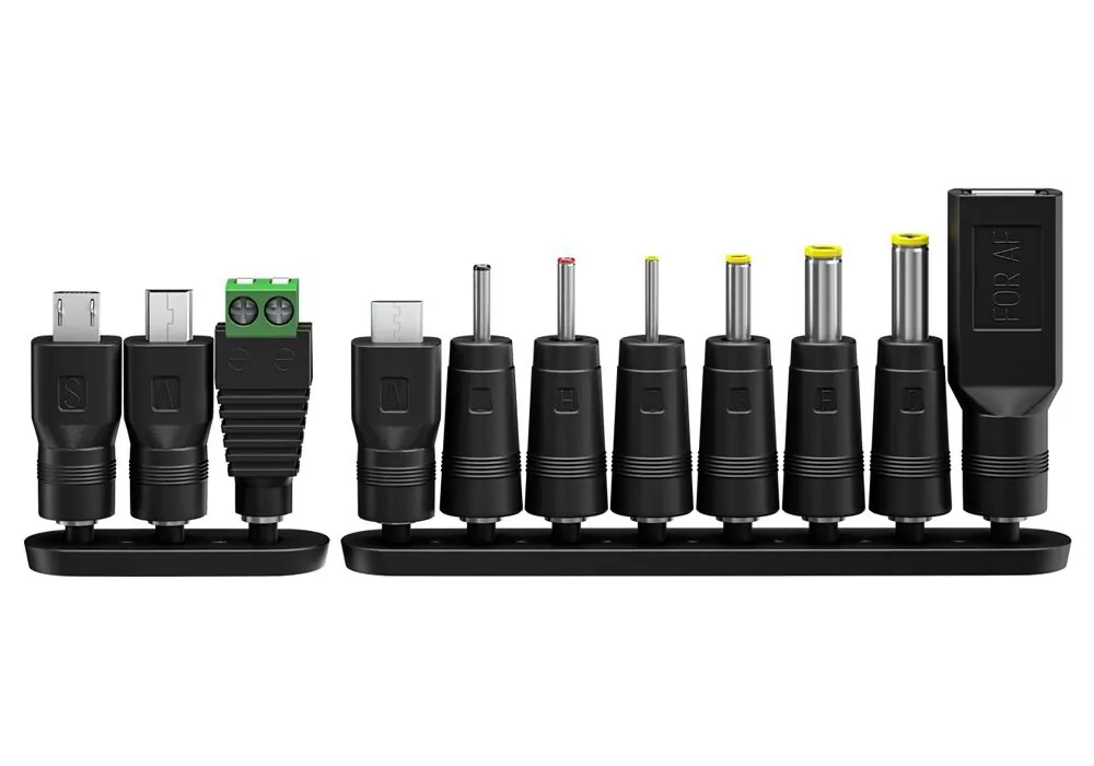 Universal φορτιστής της Goobay για την φόρτιση και τροφοδοσία ηλεκτρικών συσκευών. Διαθέτει 7 διαφορετικά βύσματα τροφοδοσίας και αντάπτορες USB, USB-C, micro USB, USB mini και screw terminal connection.