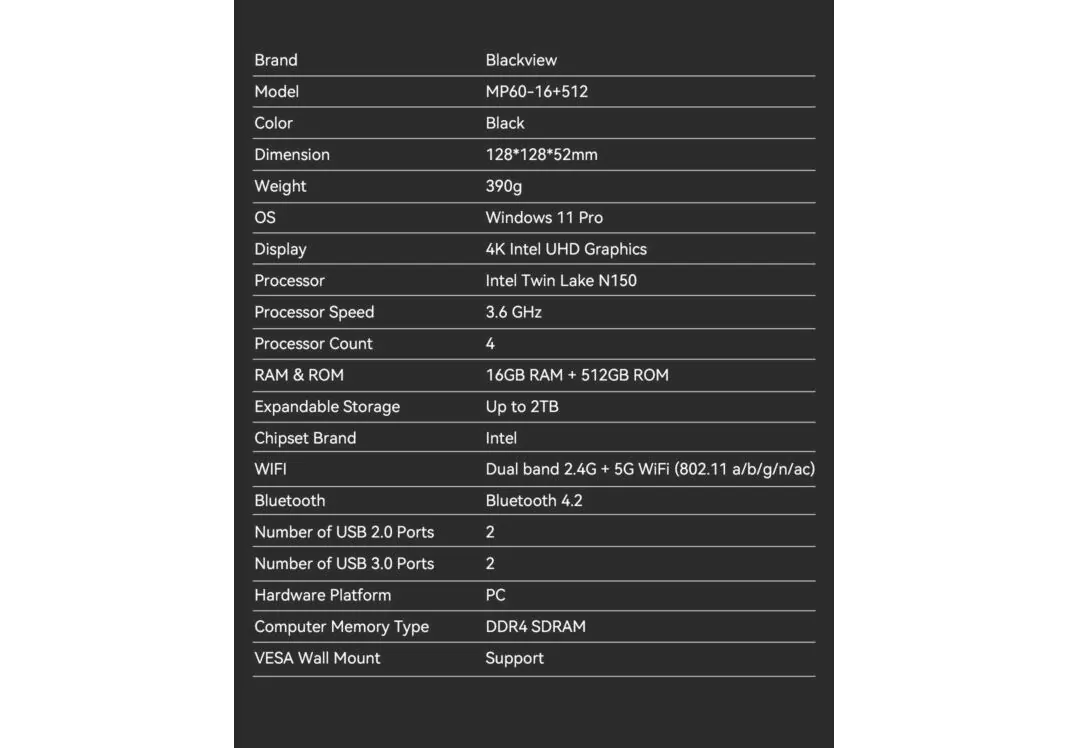 Το Blackview Mini PC Intel N150 16GB+1TB είναι η ιδανική επιλογή για όσους θέλουν ένα ισχυρό, μικρό και ευέλικτο υπολογιστικό σύστημα, κατάλληλο για επαγγελματική χρήση, streaming και καθημερινή ψυχαγωγία.