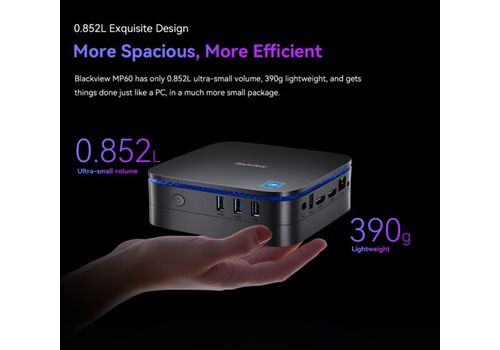 Το Blackview MP60 Mini PC συνδυάζει συμπαγές μέγεθος με ισχυρές επιδόσεις, αποτελώντας την ιδανική λύση για εργασία, ψυχαγωγία και καθημερινή χρήση. Με διαστάσεις μόλις 128 x 128 x 52 mm και βάρος 390g, προσφέρει εξαιρετική φορητότητα, ενώ η Ultra-small volume κατασκευή 0.852L εξοικονομεί χώρο στο γραφείο ή στο σπίτι σας.