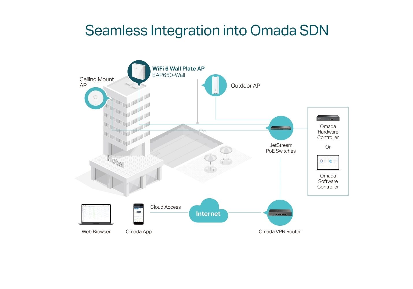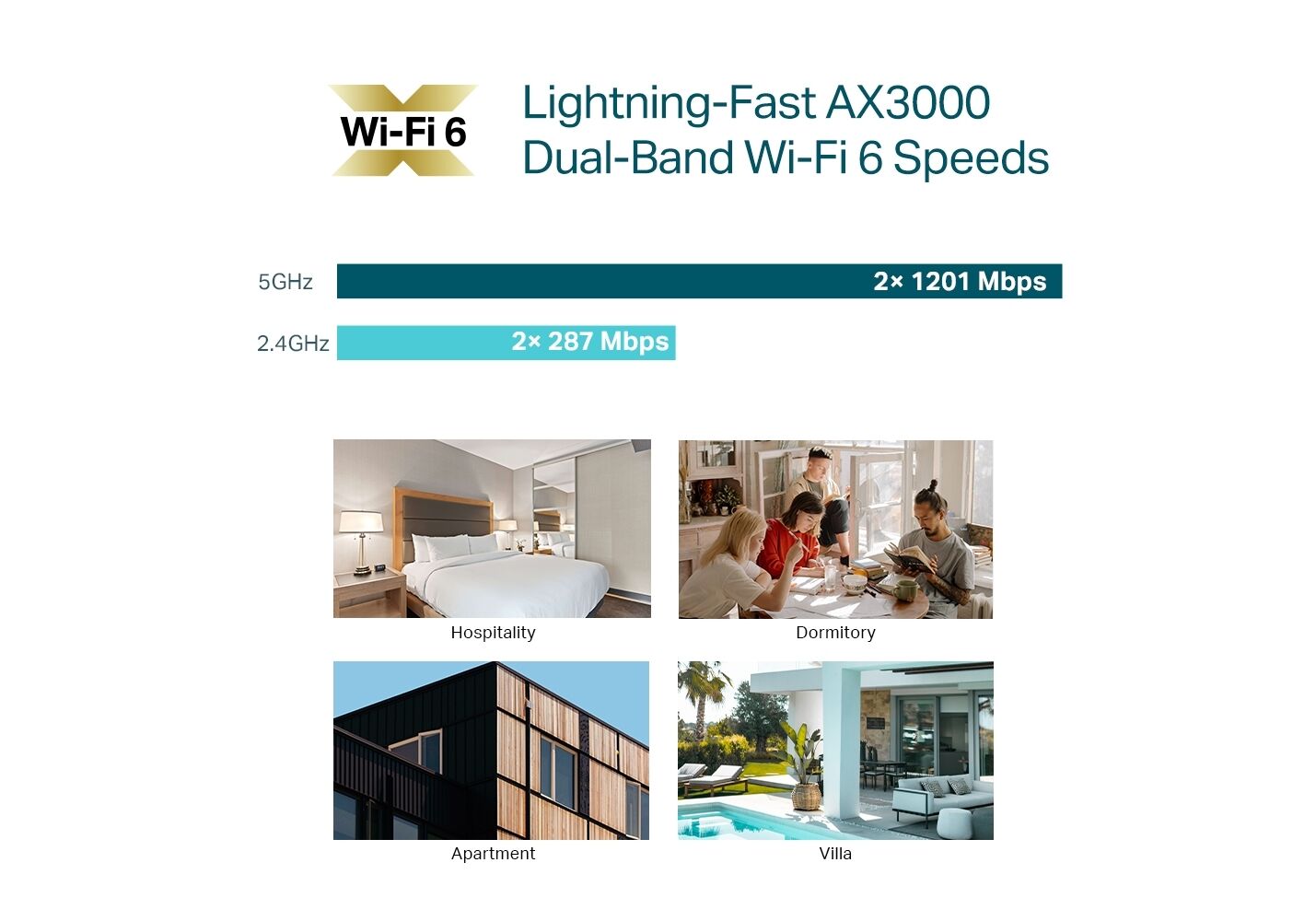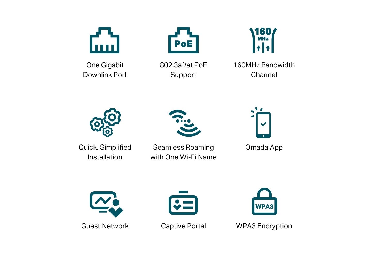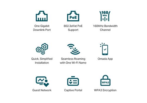 | AX3000 WiFi 6 Ταχύτητες: : Ταυτόχρονα 574 Mbps στα 2,4 GHz και 2402 Mbps στα 5 GHz συνολικές ταχύτητες WiFi 2976 Mbps. Πλήρης κάλυψη WiFi στο δωμάτιο : Εγγυημένα ισχυρά σήματα και κάλυψη WiFi από γωνία σε γωνία. Θύρα Gigabit : Συνδέστε ενσύρματες συσκευές με μία θύρα gigabit downlink. Κεντρική Διαχείριση Cloud : Ενσωματώνεται στο Omada SDN για πρόσβαση στο cloud και απομακρυσμένη διαχείριση. Ασφαλές δίκτυο επισκεπτών : Εφαρμόστε πολλαπλές επιλογές ελέγχου ταυτότητας (SMS/Voucher) γεμάτες με τεχνολογίες ασύρματης ασφάλειας υψηλής ποιότητας. |