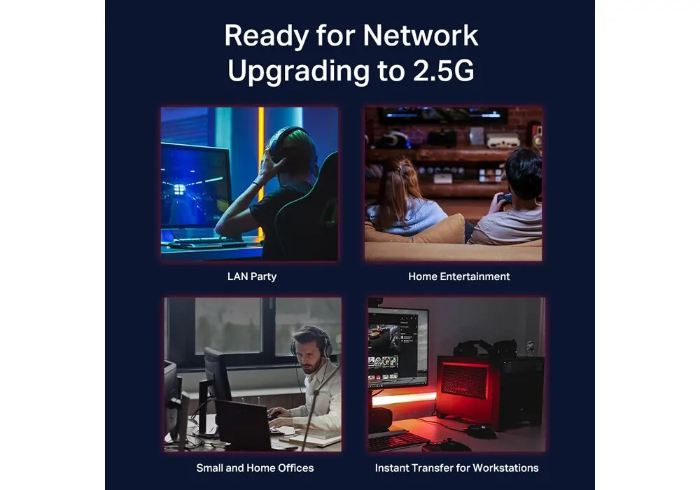 Οι συνδέσεις Auto-negotiation 3 ταχυτήτων (100Mb/1G/2.5G) αντιλαμβάνονται τις ταχύτητες σύνδεσης και προσαρμόζονται έξυπνα ώστε να προσφέρουν την βέλτιστη απόδοση για όλες τις συσκευές σας, συμπεριλαμβανομένων 2.5G NAS, 2.5G PCIe adapter, gaming κονσόλα, VR gaming, 2.5G WiFi 6 AP κ.α.