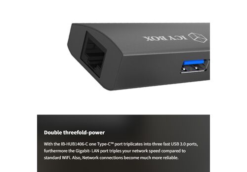 Διπλάσια Τριπλή Ισχύς Με τον IB-HUB1406-C, μία θύρα Type-C™ διπλασιάζεται σε τρεις γρήγορες θύρες USB 3.0, ενώ η θύρα Gigabit LAN τριπλασιάζει την ταχύτητα του δικτύου σας σε σχέση με το κανονικό WiFi.