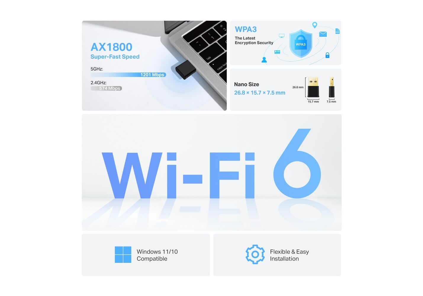 Fast WiFi 6 - Break the gigabit barrier with speeds up to 1201 Mbps (5 GHz) + 574 Mbps (2.4 GHz).