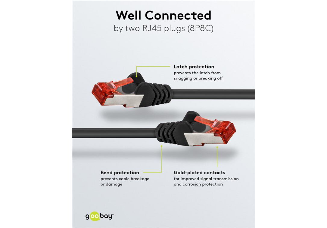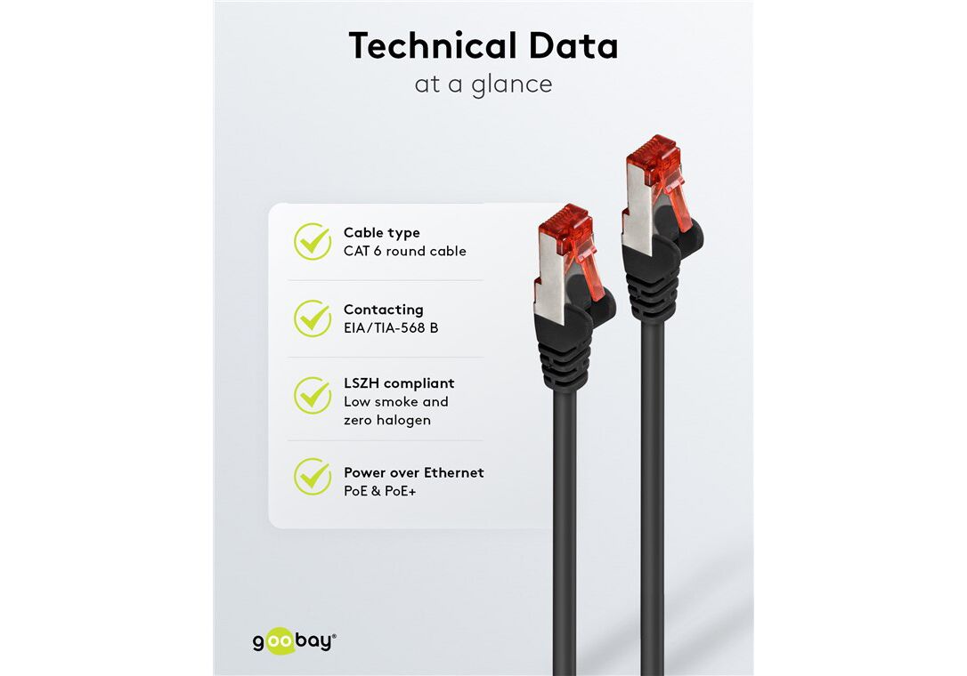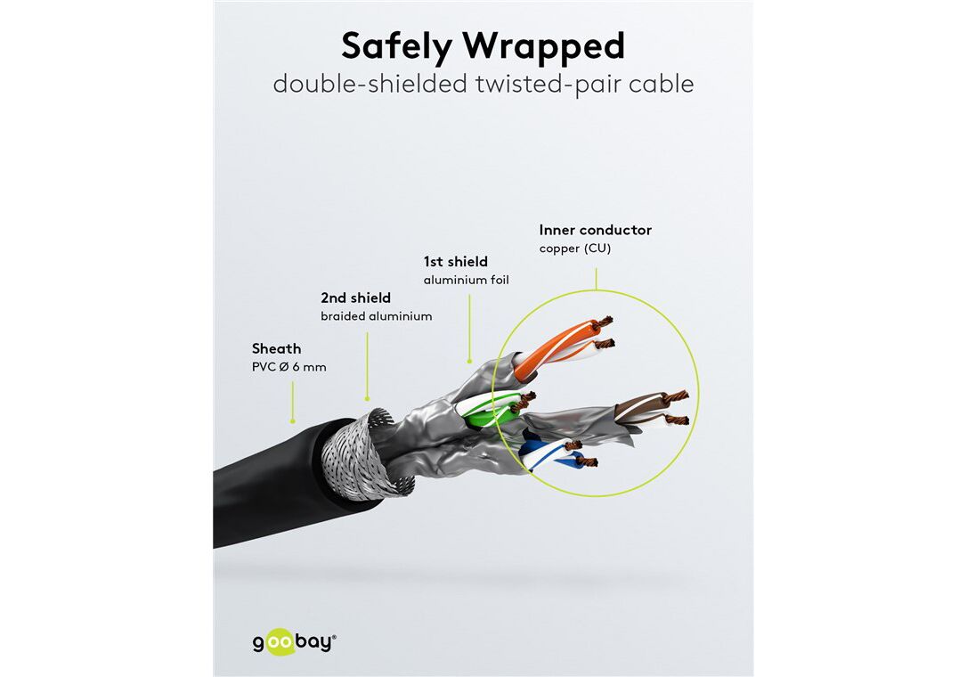 Τα καλώδια δικτύου της Goobay κατασκευάζονται από ποιοτικά υλικά, με τις υψηλότερες τεχνικές προδιαγραφές, προσφέροντας αξιόπιστη λειτουργία υψηλής απόδοσης, με αντοχή στον χρόνο.