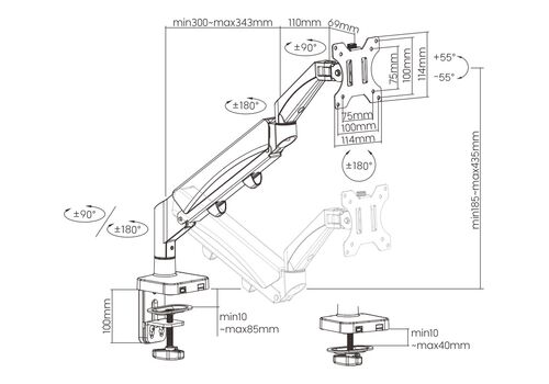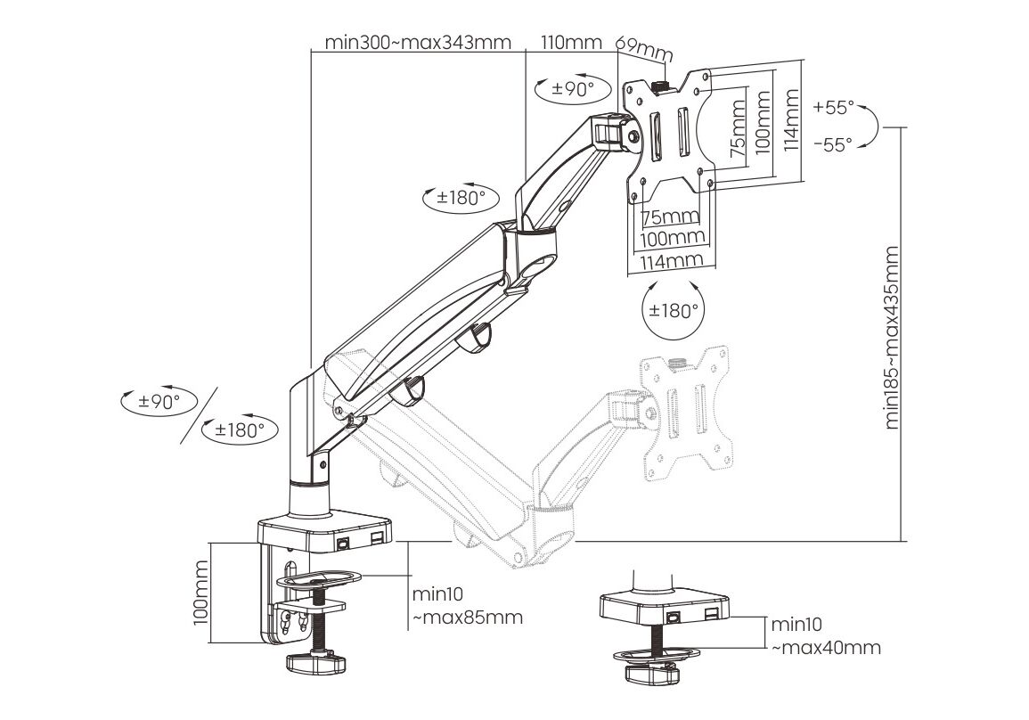 Πάχος επιφάνειας εργασίας: Clamp: 10~85mm, Grommet: 10~40mm