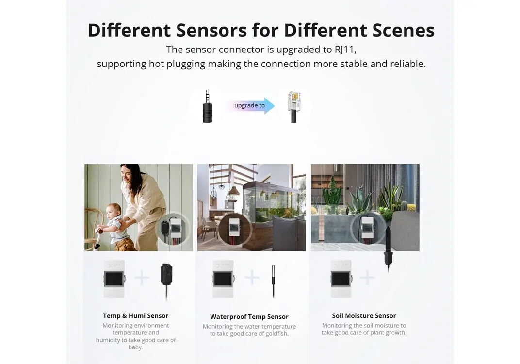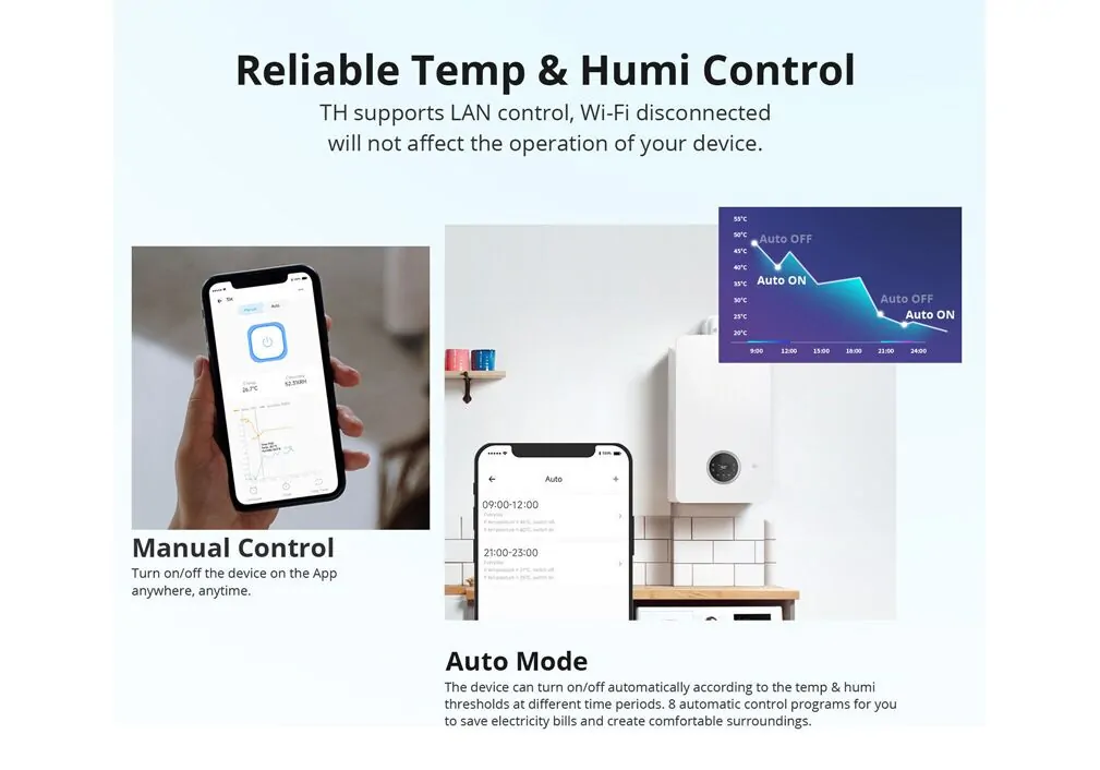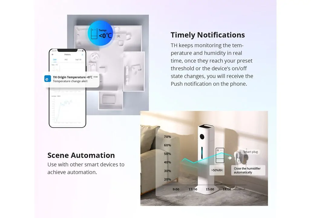 Συνδέεται μέσω Wi-Fi και της εφαρμογής eWeLink με το smartphone σας επιτρέποντας σας να παρακολουθείτε σε πραγματικό χρόνο την θερμοκρασία και την υγρασία αλλά και να ελέγχετε απομακρυσμένα τις συνδεδεμένες συσκευές σας.