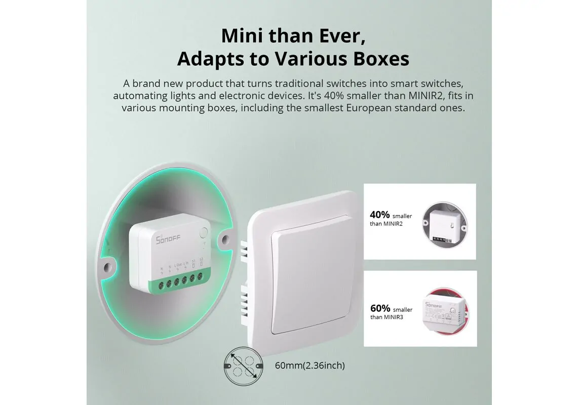Το MINIR4M είναι ένας smart διακόπτης της Sonoff που μετατρέπει έναν συμβατικό, επιτοίχιο διακόπτη σε smart, δίνοντάς σας την δυνατότητα να διαχειρίζεστε απομακρυσμένα τον φωτισμό του χώρου σας μέσω smartphone.