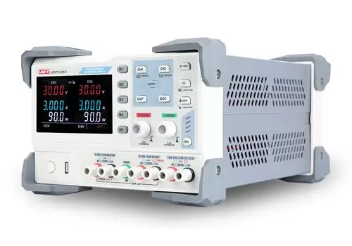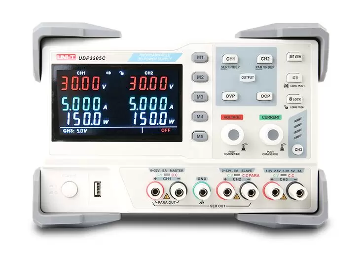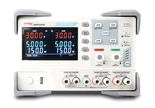 Τροφοδοτικό πάγκου 3 καναλιών από την Uni-T. Διαθέτει 4 ανεξάρτητες εξόδους, 2 από αυτές είναι ρυθμιζόμενες των 30V/5A, 1 σταθερής επιλεγμένης εξόδου των 1.8V/2.5V/3.3V/5V/3A, και USB με έξοδο 5V/2A. Με constant voltage (CV) και constant current (CC) modes, προστασία από βραχυκύκλωμα και υπερφόρτωση, το DC τροφοδοτικό πάγκου UDP3305C χαρακτηρίζεται για την εξαιρετική απόδοση του.
