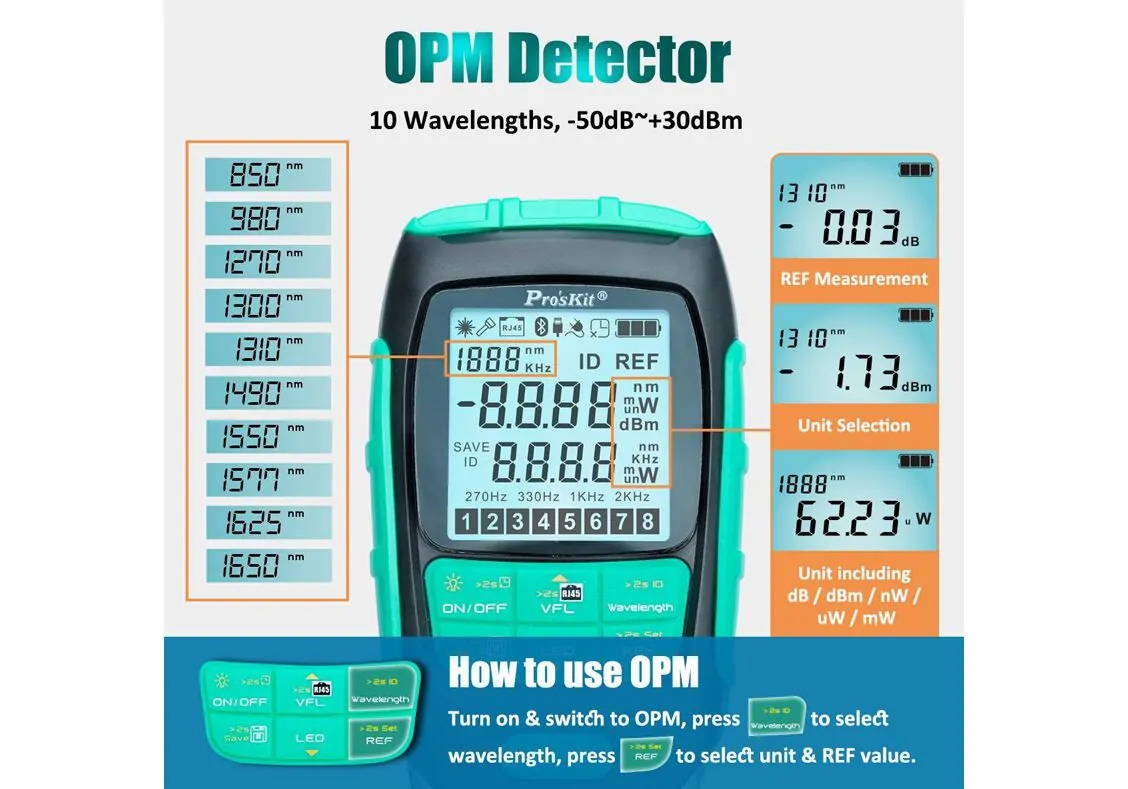 -Measuring wavelength: 850/980/1270/1300/1310/1490/1550/1577/1625/1650nm