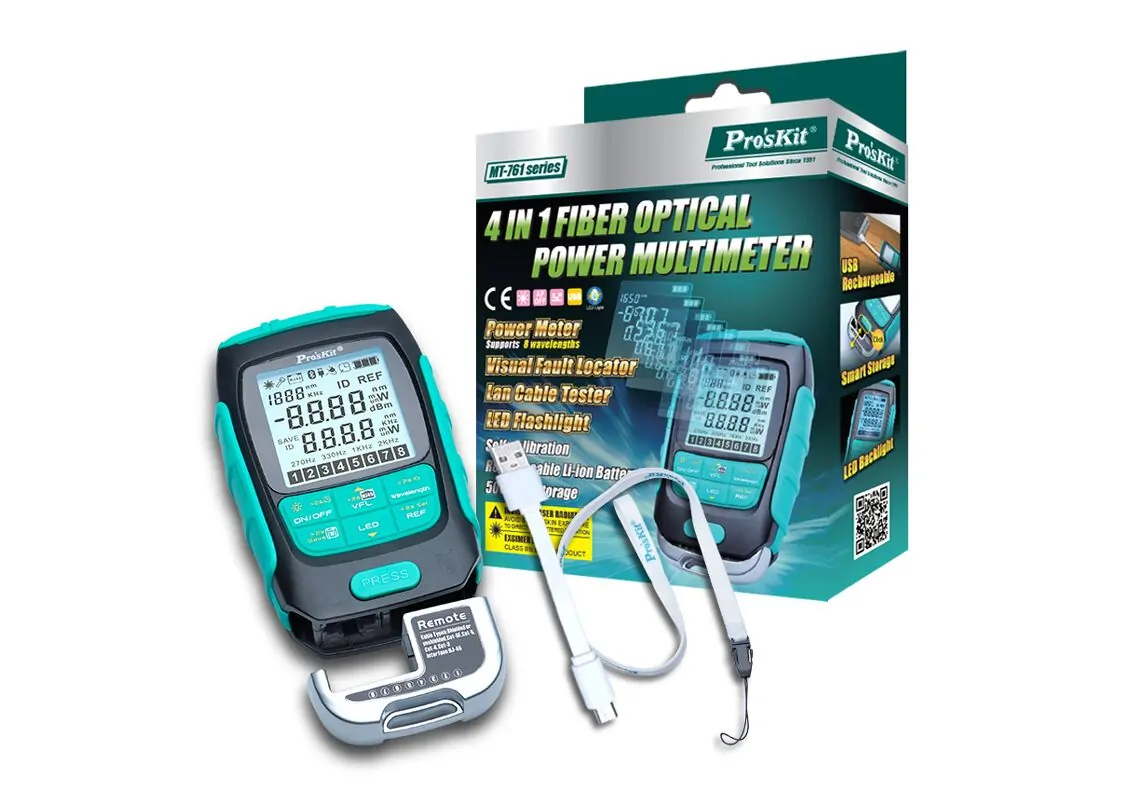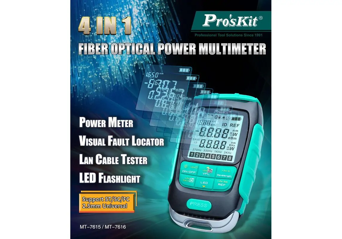 Το MT-7616 από την PROSKIT είναι ένα πολύμετρο για την μέτρηση ισχύος και την ανίχνευση θέσης οπτικού σφάλματος σε οπτικές ίνες.