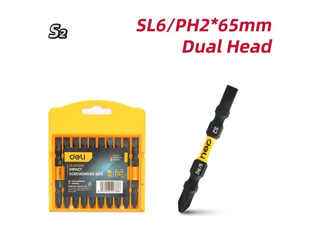 DELI σετ μύτες κατσαβιδιού DL252202D για δραπανοκατσάβιδο, διπλή κεφαλή, σταυρωτές/ίσιες, SL6/PH2x65mm, 10τμχ