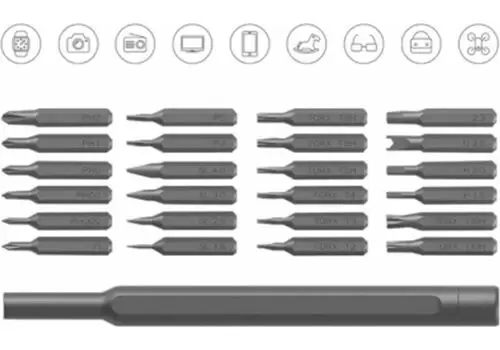 Το σετ κατσαβιδιών της Xiaomi περιέχει 24 κεφαλές. Περιλαμβάνεται κουτί αποθήκευσης αλουμινίου για μεταφορά και αποθήκευση. Κατάλληλο για ρολόι χαλαζία, οικιακές συσκευές όπως κάμερες, ραδιόφωνα, υπολογιστές, κινητά τηλέφωνα, κ.λπ.