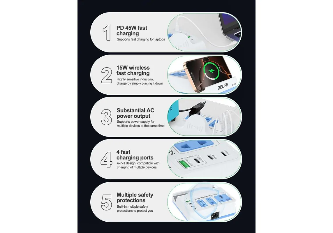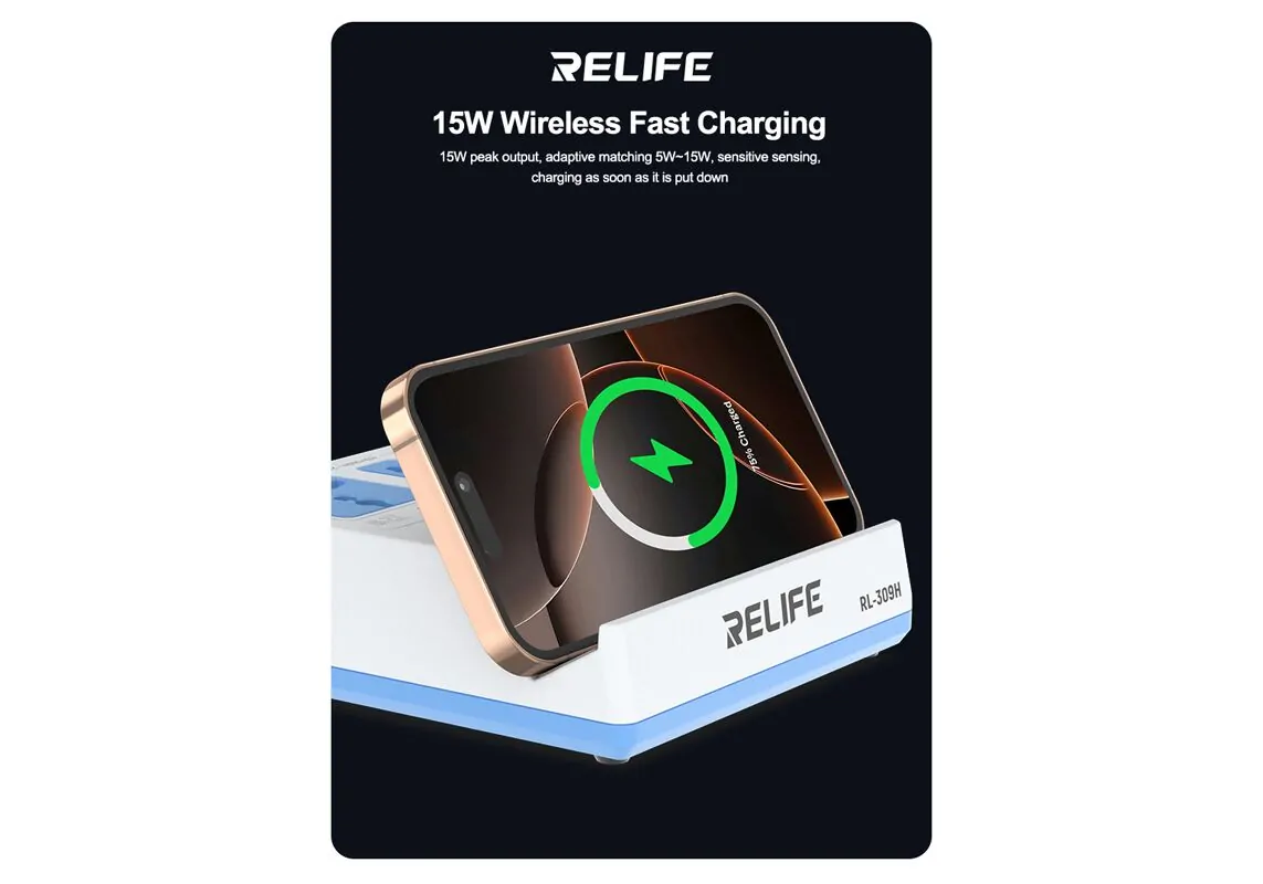 Υψηλής απόδοσης σταθμός φόρτισης της Relife, κατασκευασμένος από ανθεκτικό υλικό και συμβατός με συσκευές που φορτίζουν ασύρματα ή μέσω USB θύρας.