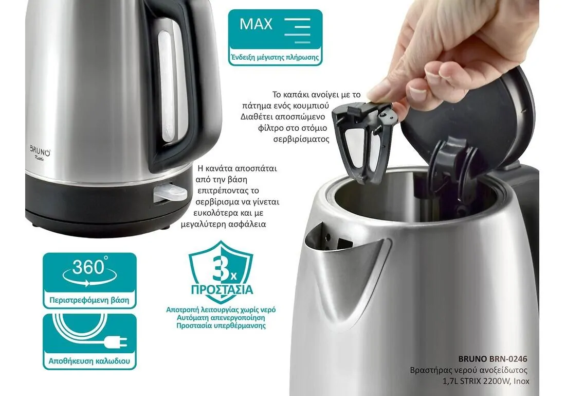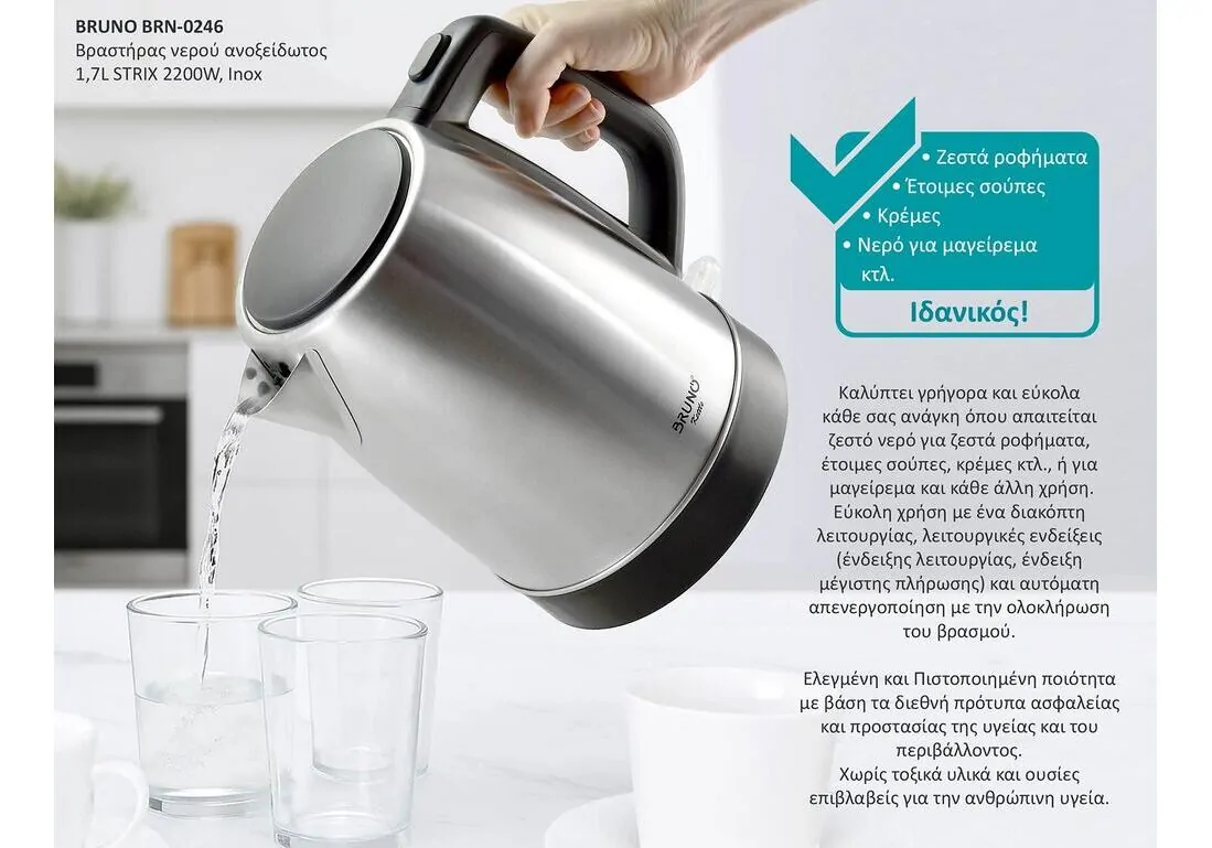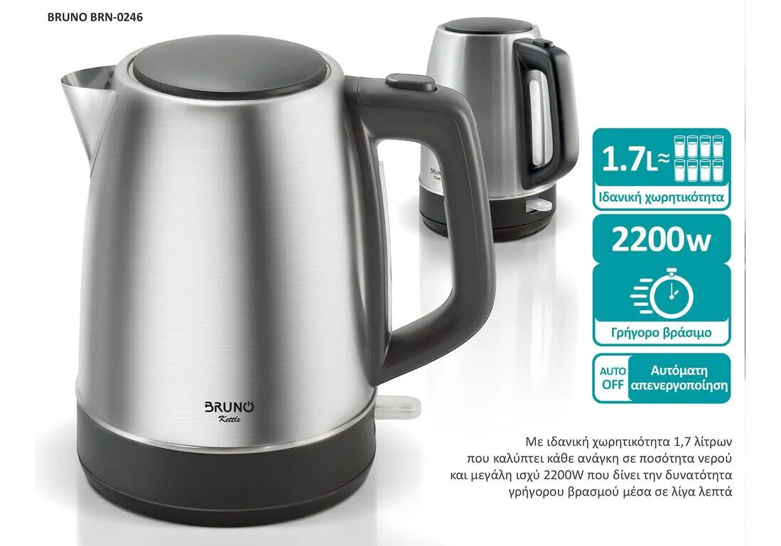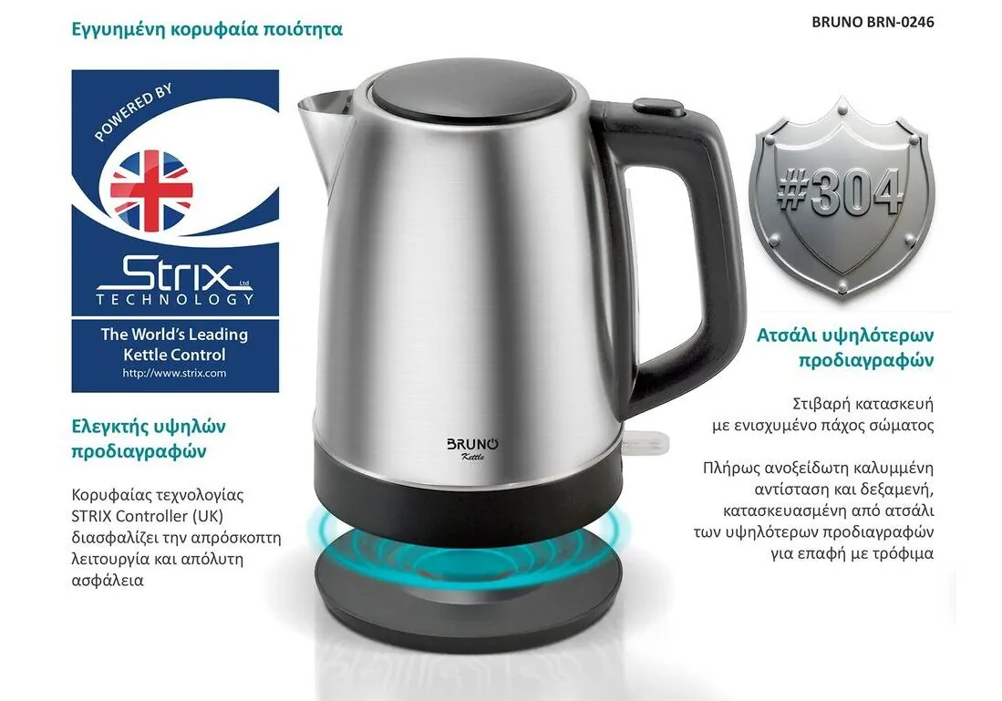 BRUNO BRN-0246 Βραστήρας νερού ανοξείδωτος 1.7L STRIX 2200W, Inox