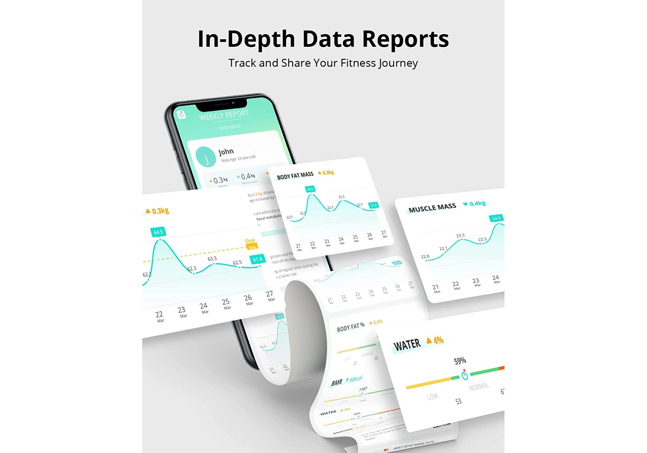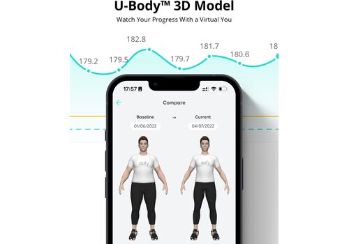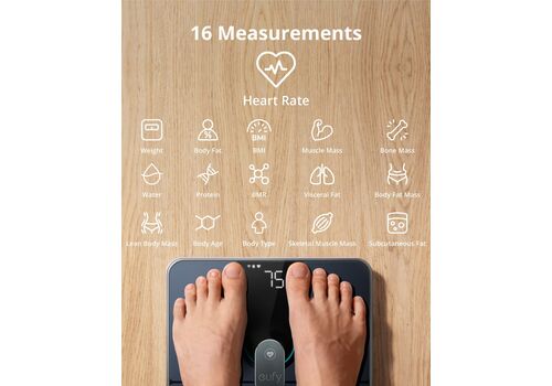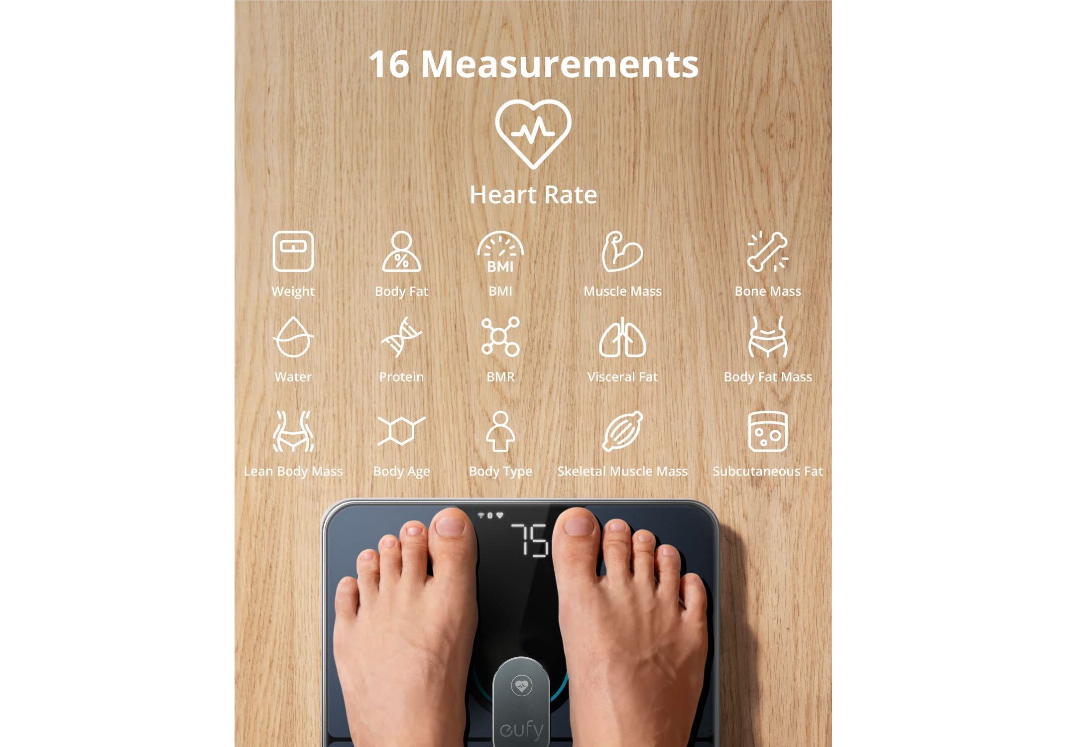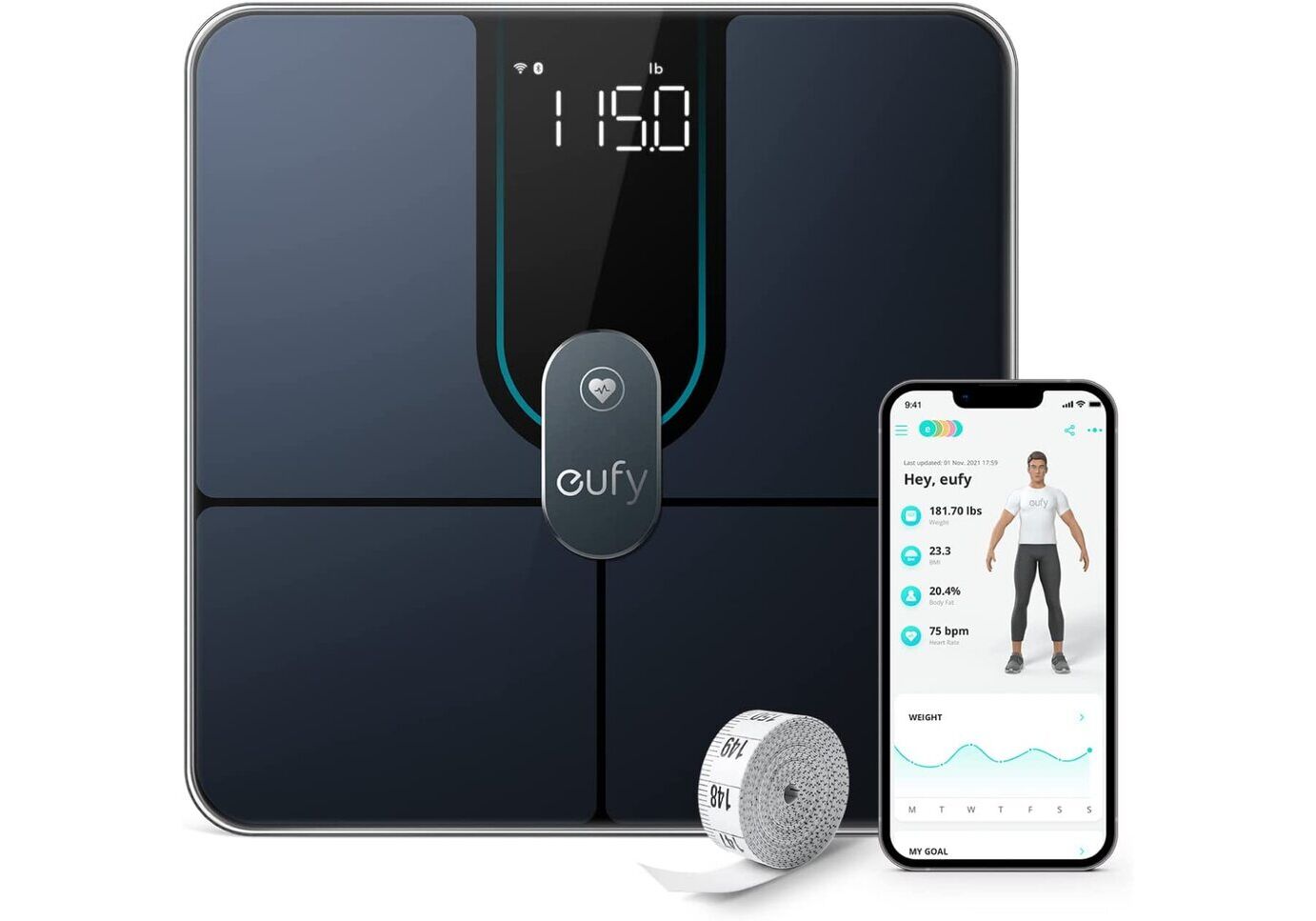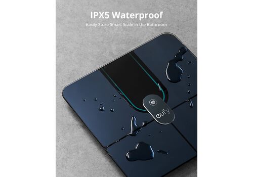 Ψηφιακή ζυγαριά μπάνιου σε μαύρο χρώμα της εταιρείας Eufy με δυνατότητα υπολογισμού του σωματικού λίπους. Παρέχει συνδεσιμότητα με άλλες συσκευές μέσω Wi-Fi.