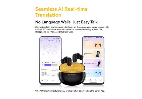 Ανακαλύψτε τα νέα Blackview AirBuds 30, τα πρώτα ασύρματα ακουστικά που συνδυάζουν πεντακάθαρο ήχο, άνεση για όλη μέρα, αντοχή σε νερό (IPX7) και – πάνω απ’ όλα – την πρωτοποριακή δυνατότητα AI αυτόματης μετάφρασης σε 134 γλώσσες, απευθείας στο αυτί σας!