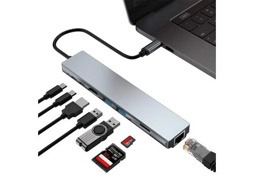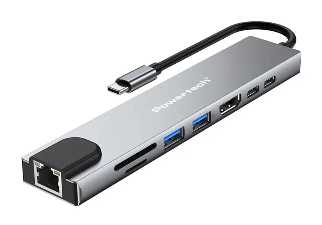 POWERTECH docking station PT-1536, 8 θυρών, USB-C σύνδεση, 87W PD, 100Mbps, γκρι