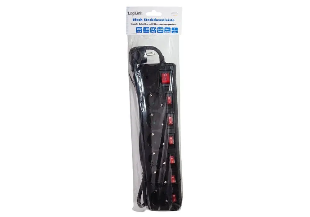 Το πολύπριζο 6 κατευθύνσεων της LogiLink προσφέρει χώρο για να συνδέσετε έως και έξι ηλεκτρικούς καταναλωτές ταυτόχρονα. Κάθε πρίζα μπορεί να αλλάξει ξεχωριστά, καθώς κάθε πρίζα έχει τον δικό της φωτιζόμενο διακόπτη on/off. Επιπλέον, υπάρχει ένας επιπλέον διακόπτης που διακόπτει ολόκληρο το πολύπριζο. Το μήκος του καλωδίου είναι 1,5μ.
