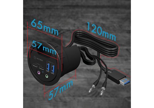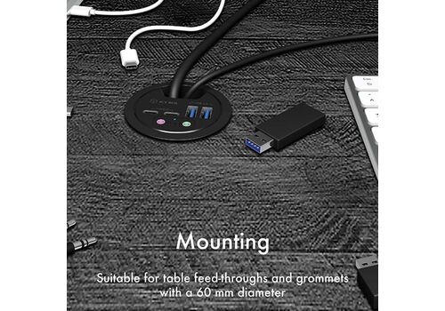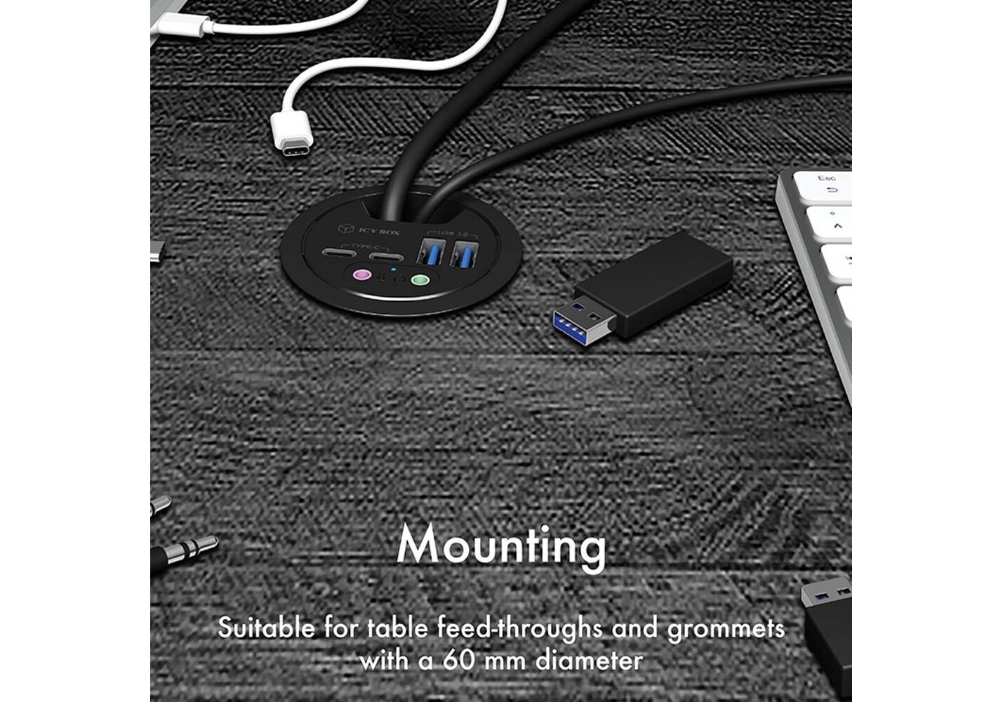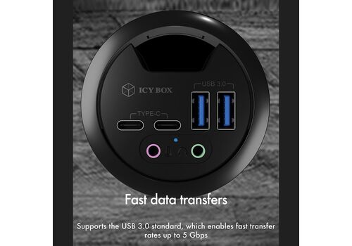 Ο ICY BOX IB-HUB1403B προσθέτει τέσσερις θύρες USB 3.0 Type-A σε μια οπή καλωδίων διαμέτρου 60 mm, επιτρέποντας τη διατήρηση της οργανωμένης διαχείρισης καλωδίων για οθόνες ή τροφοδοτικά, παράλληλα με τη χρήση του κόμβου