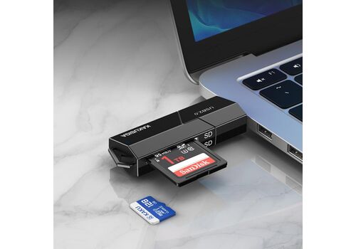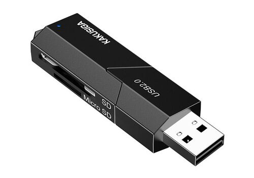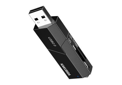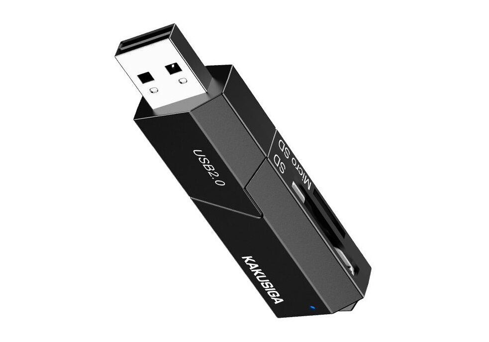 Card reader της KAKUSIGA, σε μέγεθος USB flash, με 2 υποδοχές στις οποίες μπορείτε να τοποθετήσετε μια SD και μια micro SD κάρτα μνήμης.
