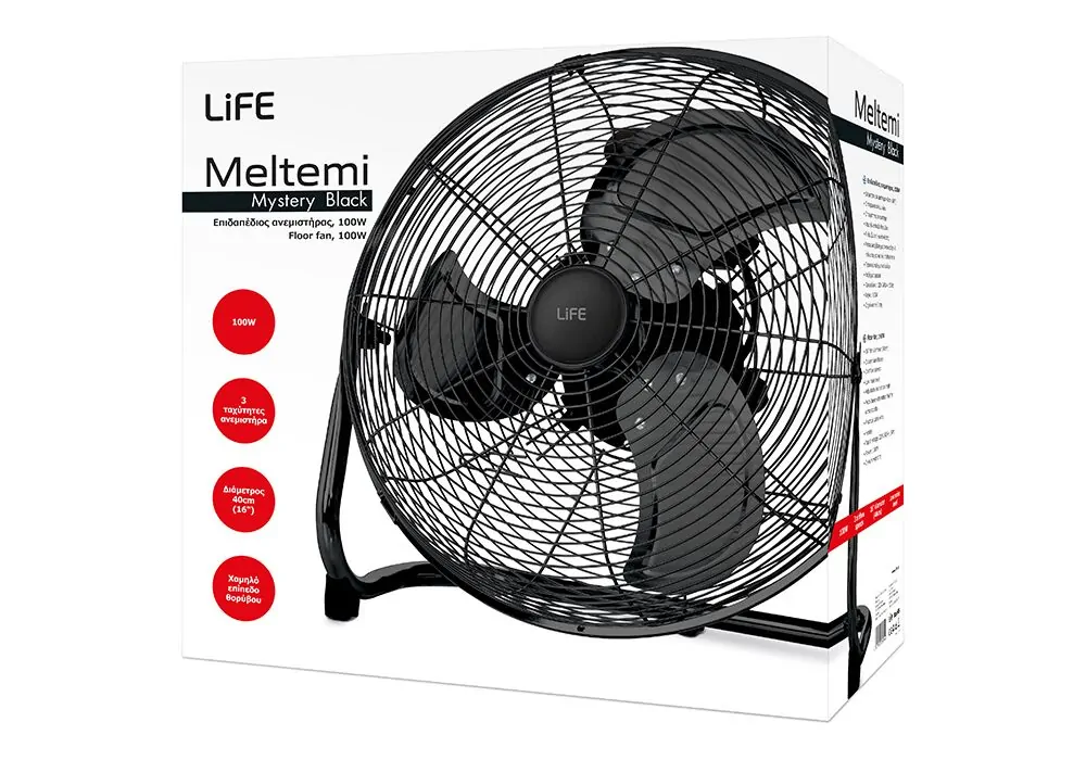 Επιδαπέδιος ανεμιστήρας, 100WΟ επιδαπέδιος ανεμιστήρας LIFE Meltemi Mystery black διαθέτει πανίσχυρο μοτέρ 100W, 3 μεγάλα πτερύγια αλουμινίου διαμέτρου 16" ( 40 εκατοστά), και αποτελεί την ιδανική επιλογή για απολαυστική δροσιά τους καλοκαιρινούς μήνες!
