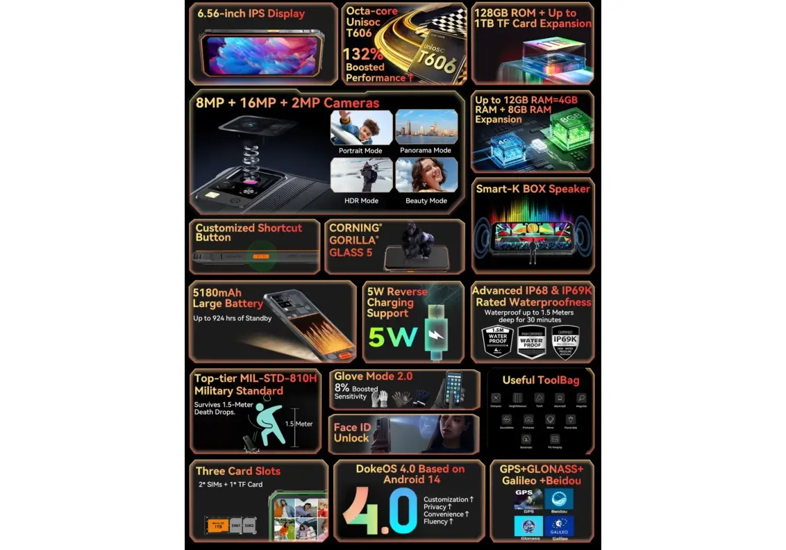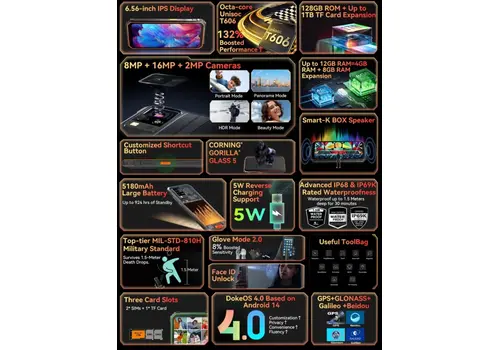 Υψηλή Προστασία IP68 & IP69K:Αδιάβροχο έως 1.5 μέτρα βάθος για 30 λεπτά.Οθόνη Φιλική προς ΓάντιαΜείνετε ζεστοί και ελέγξτε το τηλέφωνό σας χωρίς να βγάζετε τα γάντια σας, ιδανικό για εξωτερικές δραστηριότητες.