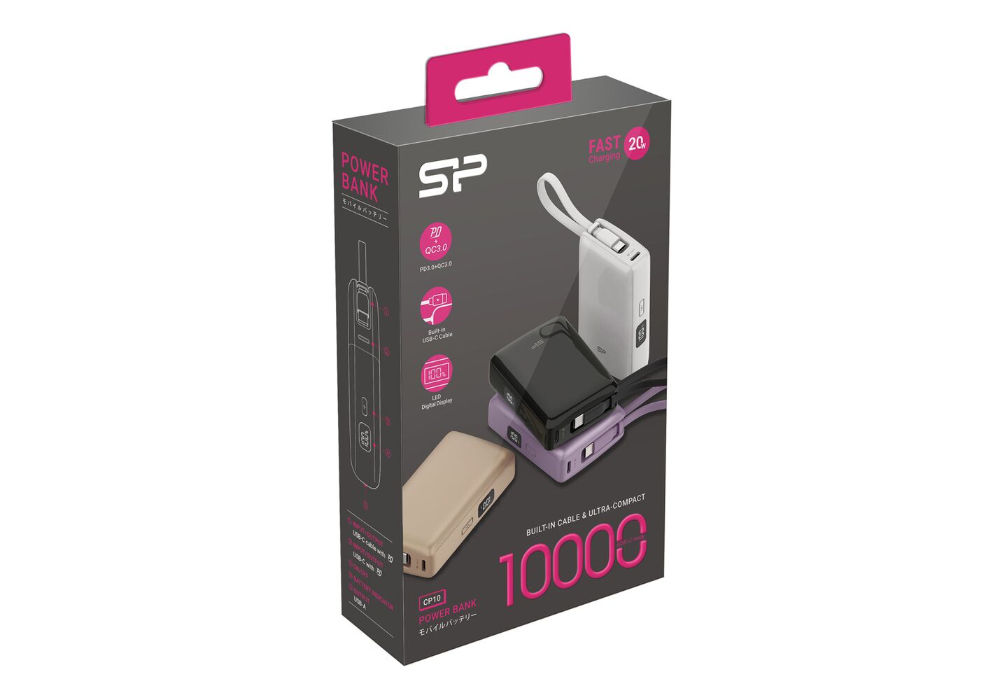 SILICON POWER power bank CP10 με καλώδιο USB-C, 2x θύρες εξόδου, 10000mAh, 20W, μαύρο