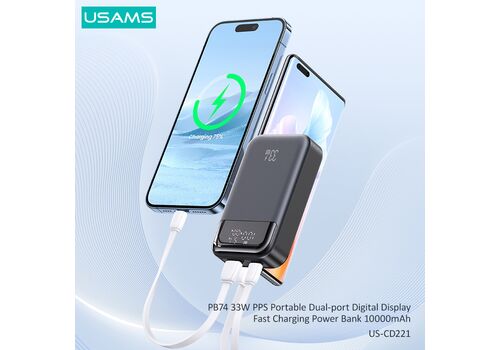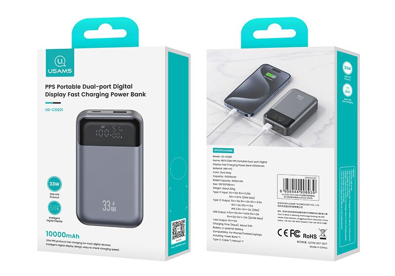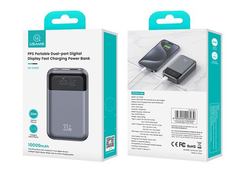 USAMS power bank CD221 με οθόνη, 2x θύρες εξόδου, 10000mAh, PPS 33W, γκρι