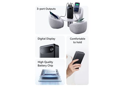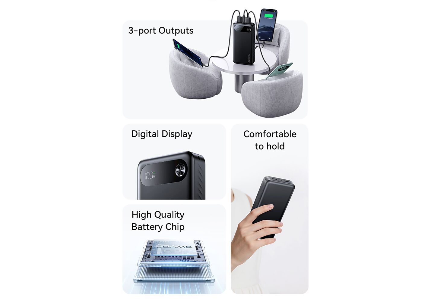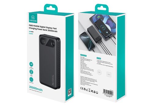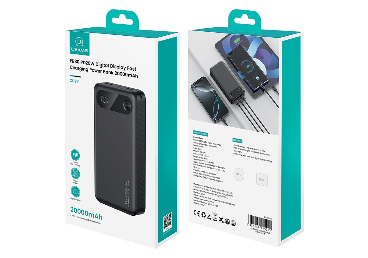 USAMS power bank CD251 με οθόνη, 3x θύρες εξόδου, 20000mAh, PD20W, μαύρο