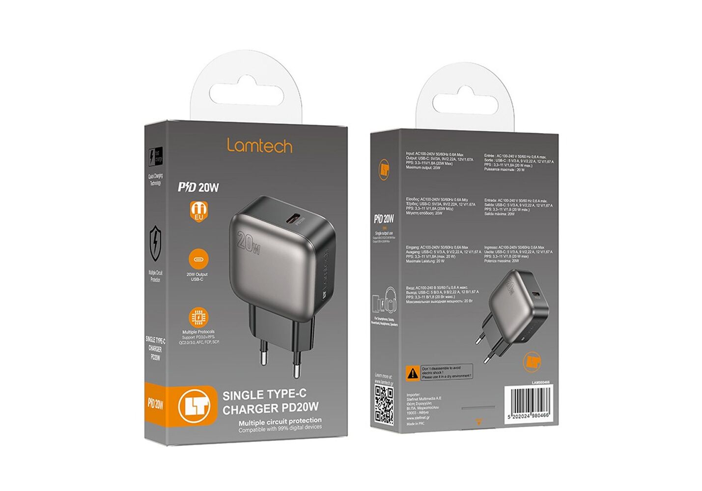 Ο LAMTECH Single Type-C Charger PD20W προσφέρει γρήγορη, ασφαλή και αποδοτική φόρτιση για smartphones, tablets, power banks, ακουστικά και ηχεία.