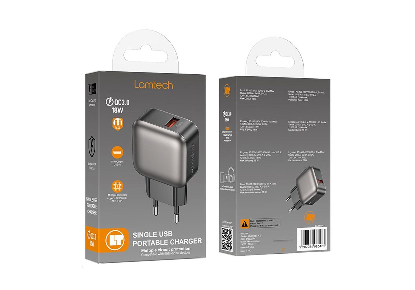 Ο LAMTECH Single USB Portable QC3.0 Charger 18W είναι ο ιδανικός φορτιστής για smartphones, tablets, power banks, ακουστικά και ηχεία, προσφέροντας γρήγορη και ασφαλή φόρτιση σε οποιοδήποτε χώρο.