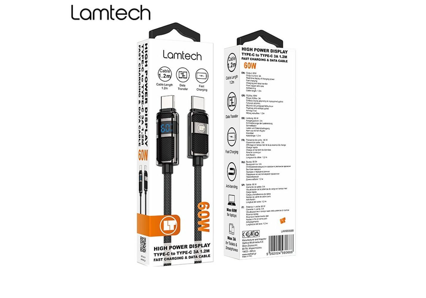 LAMTECH TYPE-C TO TYPE-C 3A HIGH POWER DISPLAY CHARGE & DATA CABLE 60W 1.2M BLACK