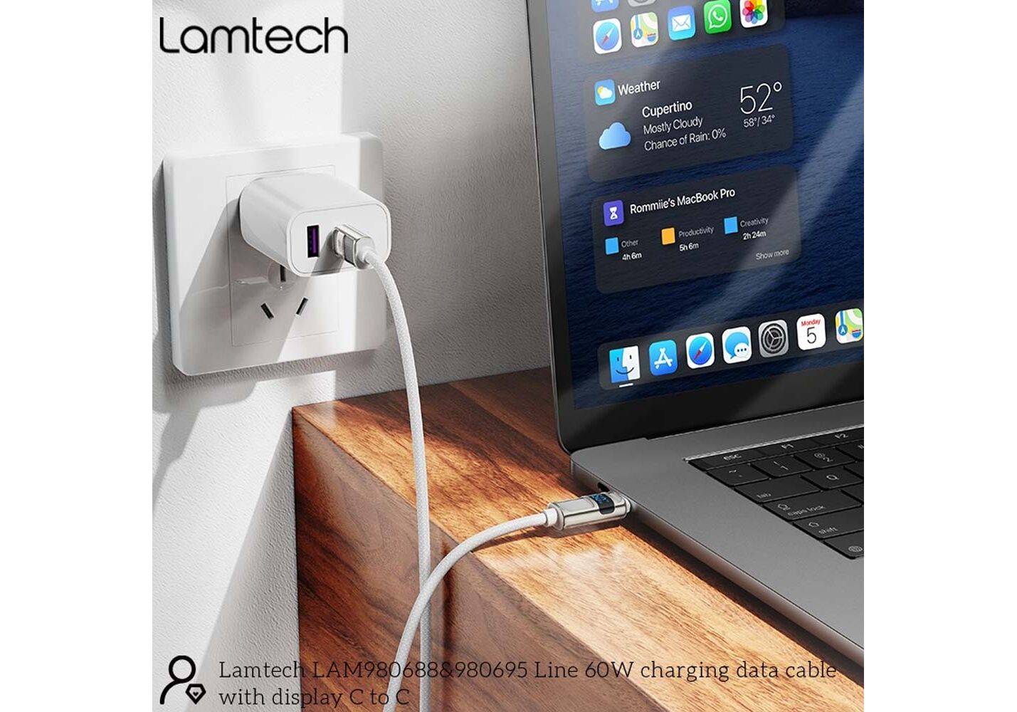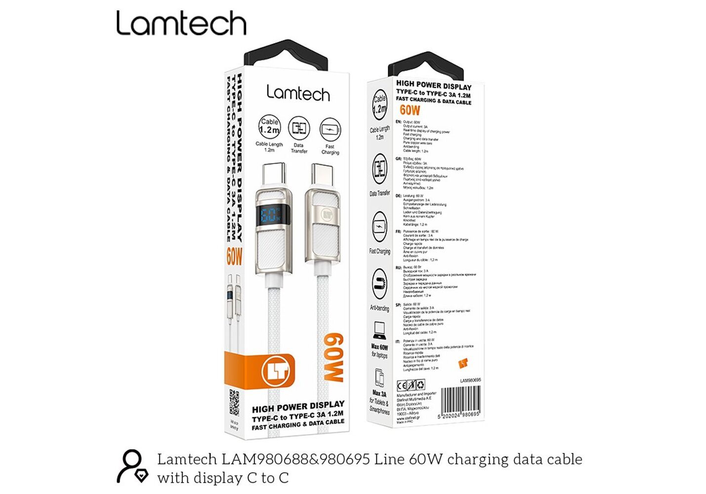 LAMTECH TYPE-C TO TYPE-C 3A HIGH POWER DISPLAY CHARGE & DATA CABLE 60W 1.2M WHITE