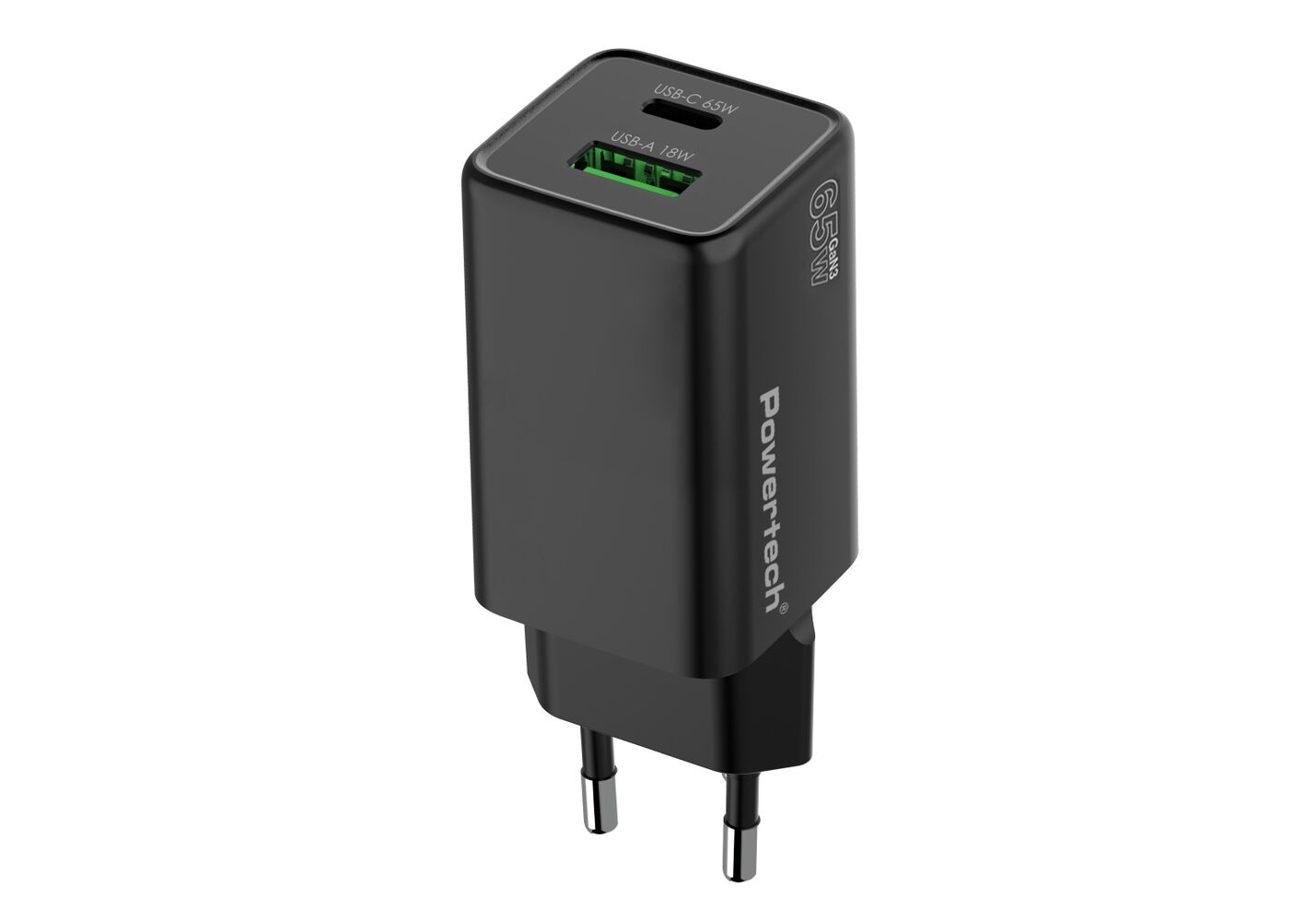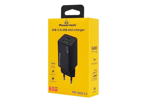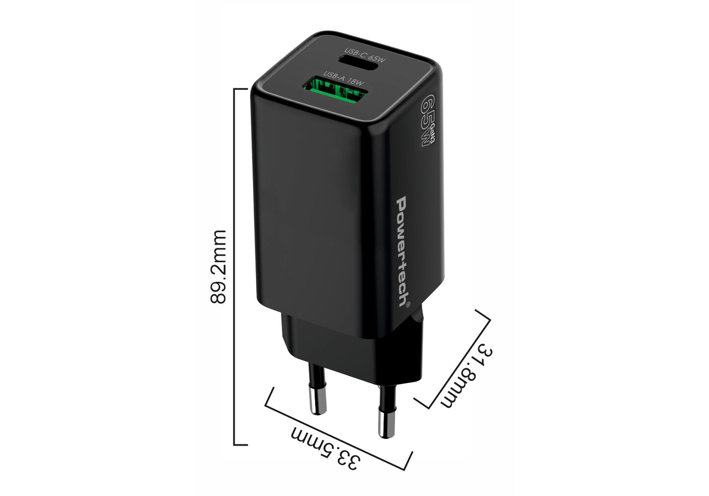 POWERTECH φορτιστής τοίχου PT-1501, USB/USB-C, 65W, GaN, μαύρος