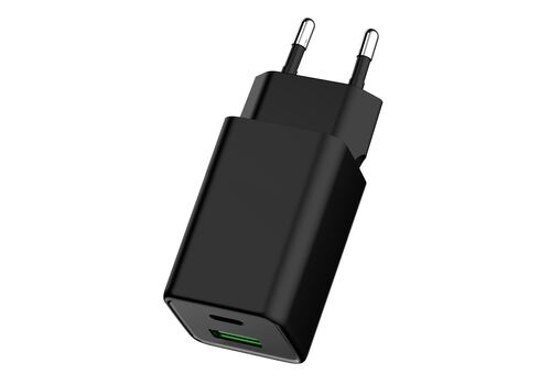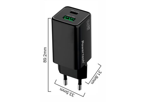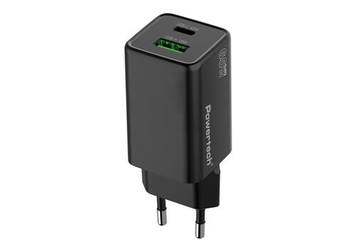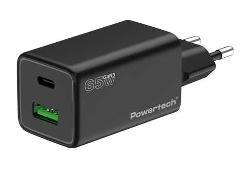 Υψηλής απόδοσης φορτιστής τοίχου της Powertech, κατασκευασμένος από ανθεκτικό υλικό και συμβατός με συσκευές που φορτίζουν μέσω θύρας USB. Διαθέτει USB και USB-C θύρες εξόδου που υποστηρίζουν φόρτιση με μέγιστη απόδοση 65W.
