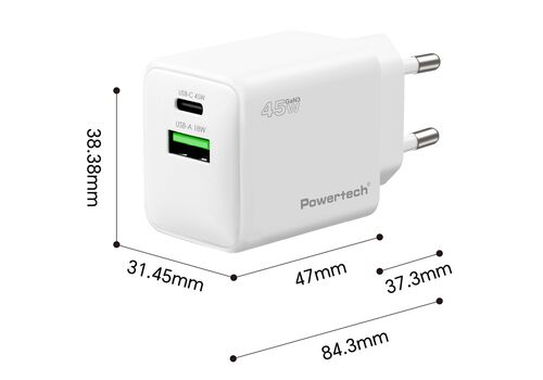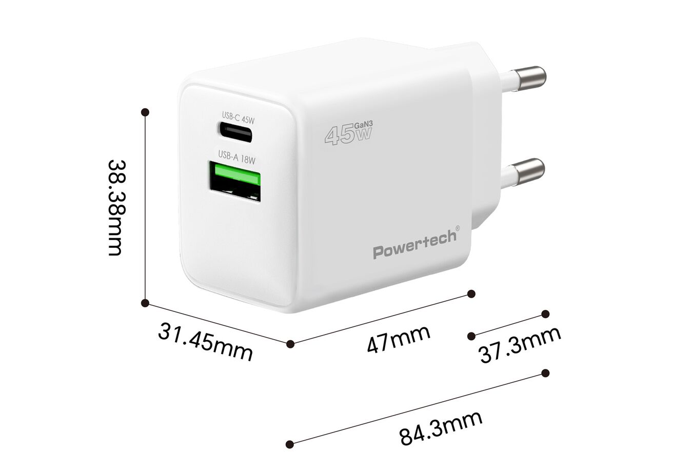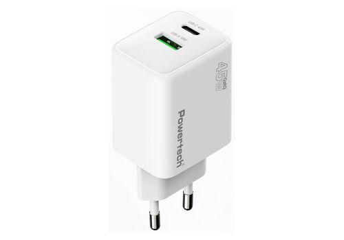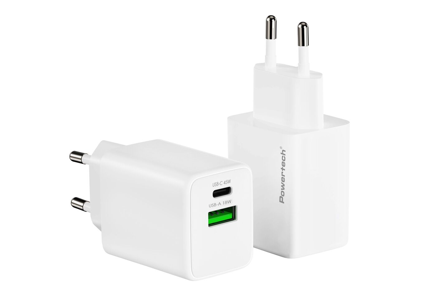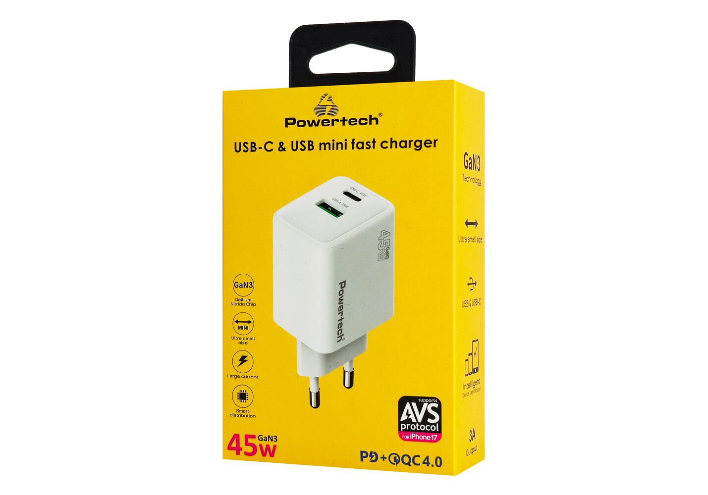 POWERTECH φορτιστής τοίχου PT-1551, USB/USB-C, 45W, GaN, AVS, λευκός