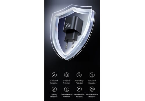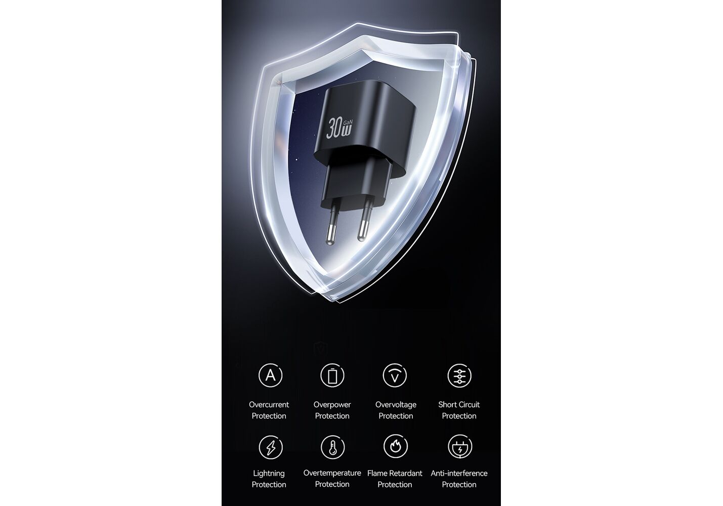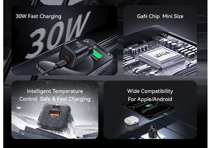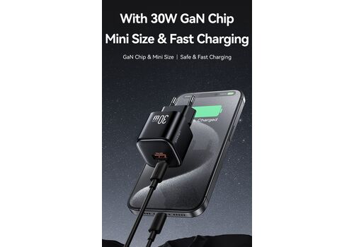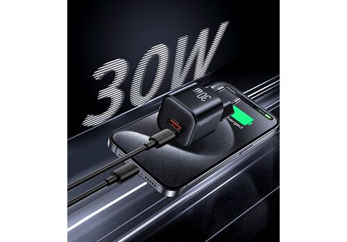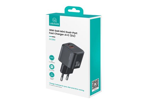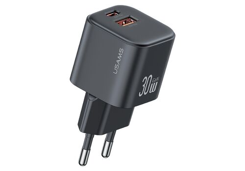 USAMS φορτιστής τοίχου CC263, USB & USB-C, 30W, GaN, μαύρος