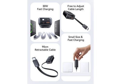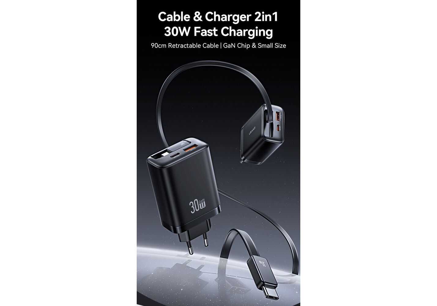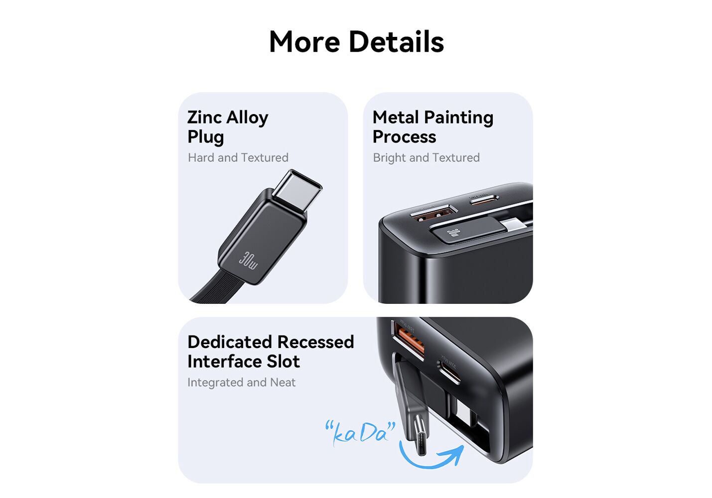 Διαθέτει 1x USB και 1x USB-C θύρες εξόδου αλλά και ενσωματωμένο καλώδιο USB-C που υποστηρίζουν φόρτιση με μέγιστη απόδοση 30W.