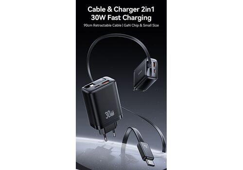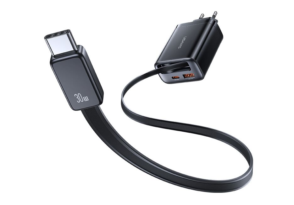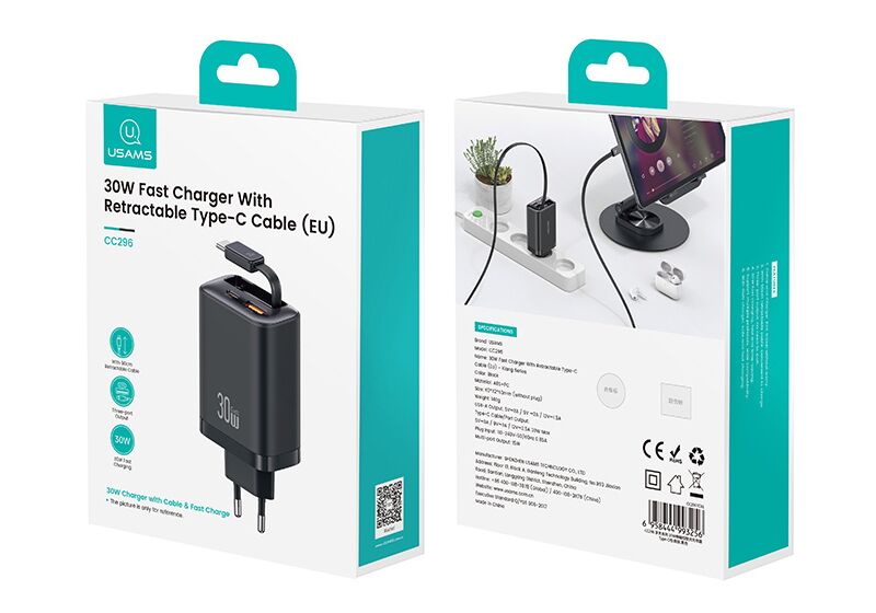USAMS φορτιστής τοίχου CC296 με καλώδιο, USB & USB-C, 30W, μαύρος