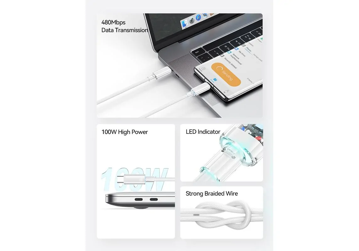 USAMS καλώδιο USB-C σε USB-C US-SJ660, 100W, 480Mbps, 1.2m, λευκό