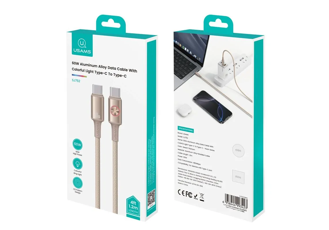 Καλώδιο φόρτισης και μεταφοράς δεδομένων USB-C σε USB-C της Usams. Υποστηρίζει φόρτιση με απόδοση έως 60W και μεταφορά δεδομένων με ταχύτητα έως 480Mbps.
