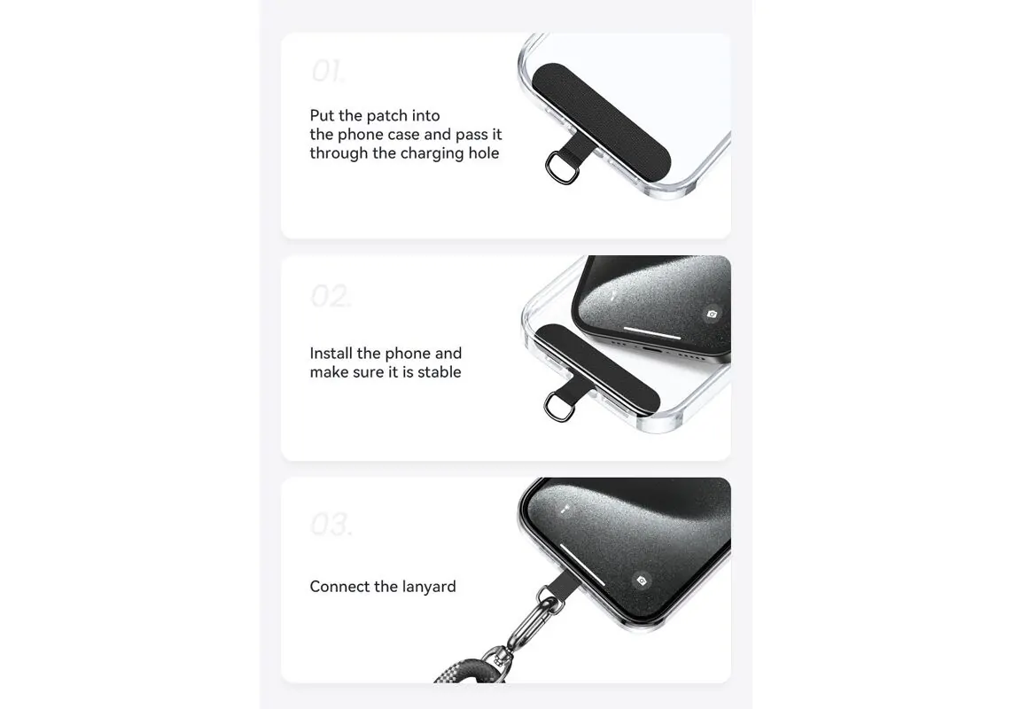 Είναι ρυθμιζόμενο και αποτελείται από 2 μέρη, το κορδόνι και ένα υφασμάτινο κομμάτι το οποίο τοποθετείται στο εσωτερικό της θήκης του κινητού, επιτρέποντας το κρέμασμα του από τον γάντζο του κορδονιού.