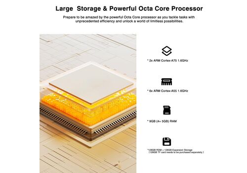 Με 4GB (+5GB virtual) RAM και 128GB ROM για να αποθηκεύετε τα αγαπημένα σας αρχεία, φωτογραφίες και βίντεο. Επιπλέον, προσφέρει την δυνατότητα να επεκτείνετε τον χώρο αποθήκευσης του tablet με κάρτα micro SD έως 1TB.