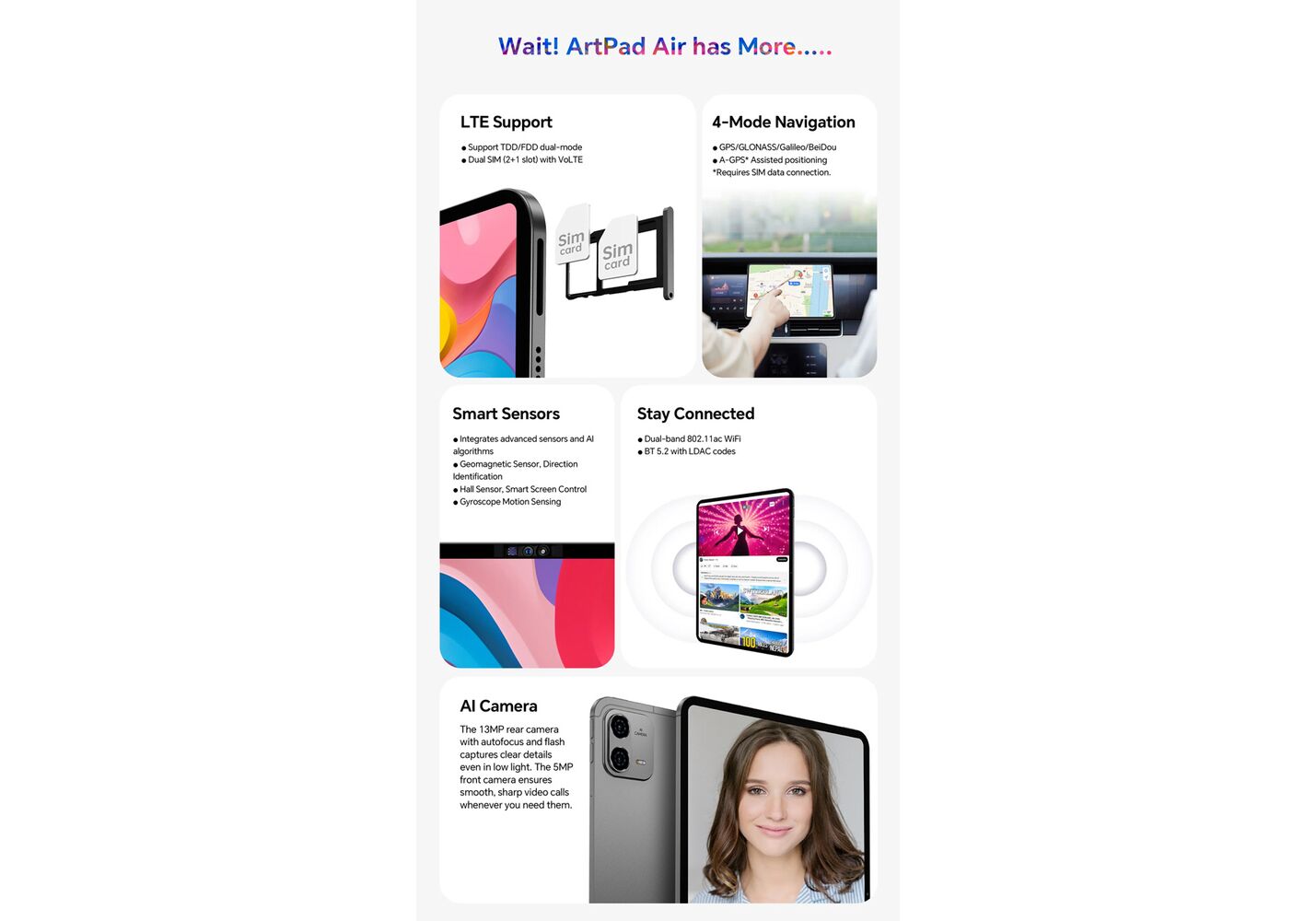 Με υποστήριξη διπλής κάρτα SIM και δικτύου 4G, το tablet ArtPad Air σας επιτρέπει να παραμείνετε συνδεδεμένοι όπου κι αν βρίσκεστε.