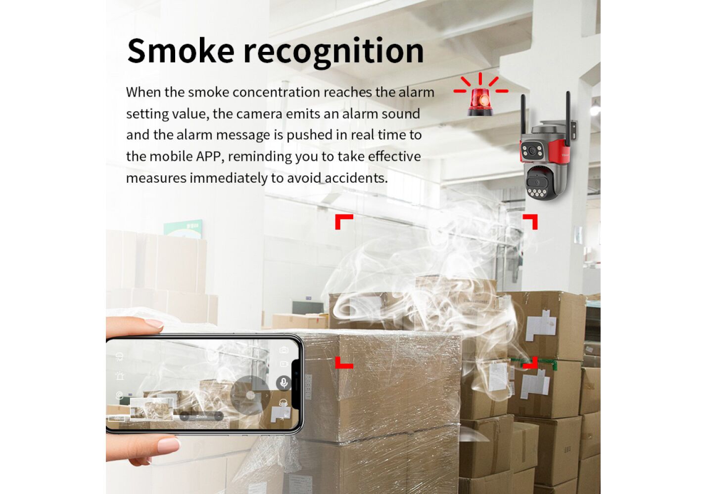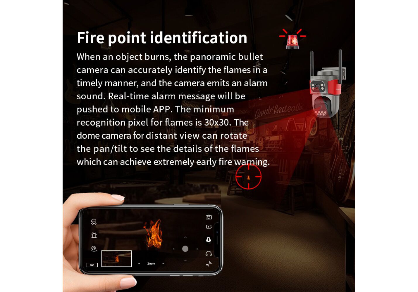 -Ανίχνευση καπνού και φωτιάς: Ανίχνευση και καδράρισμα φλόγας και καπνού, άμεσος εντοπισμός του σημείου πυρκαγιάς. Ελάχιστο pixel φλόγας: 30X30 pixel, διάρκειας άνω των 3 δευτερολέπτων. Αναγνωρίσιμα χρώματα φλόγας: υπέρυθρες, πορτοκαλί, κίτρινο. Συνιστώμενο ύψος εγκατάστασης: 3 μέτρα. Ποσοστό ανίχνευσης: 90%